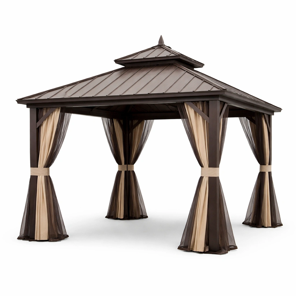 Materiales: Estructura de aluminio, techo de metal, cortinas de poliéster.