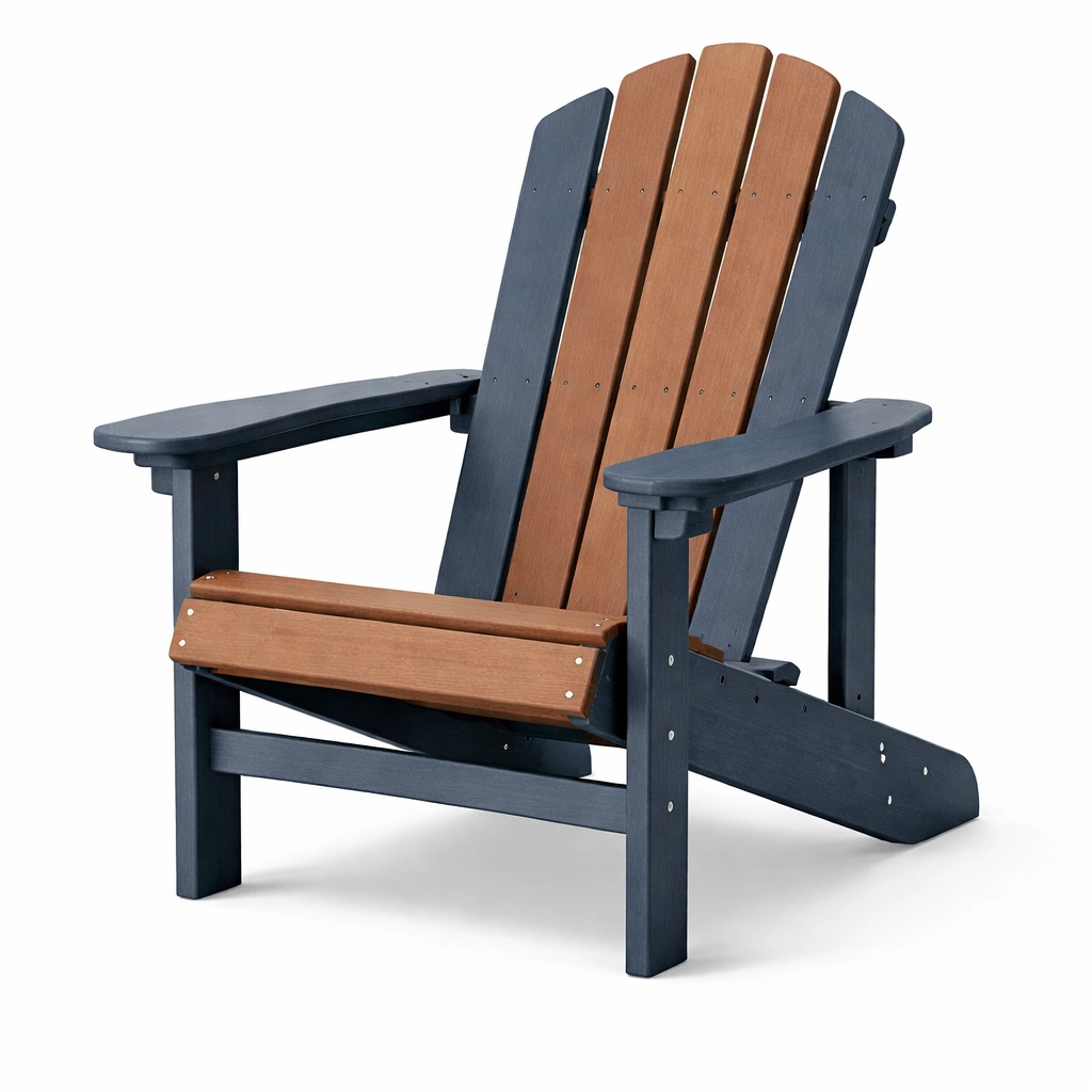 La silla Adirondack está construida con polietileno de alta densidad reciclado y madera compuesta, con tornillos de acero inoxidable, adecuada para uso en exteriores. Colores: marrón y azul.
