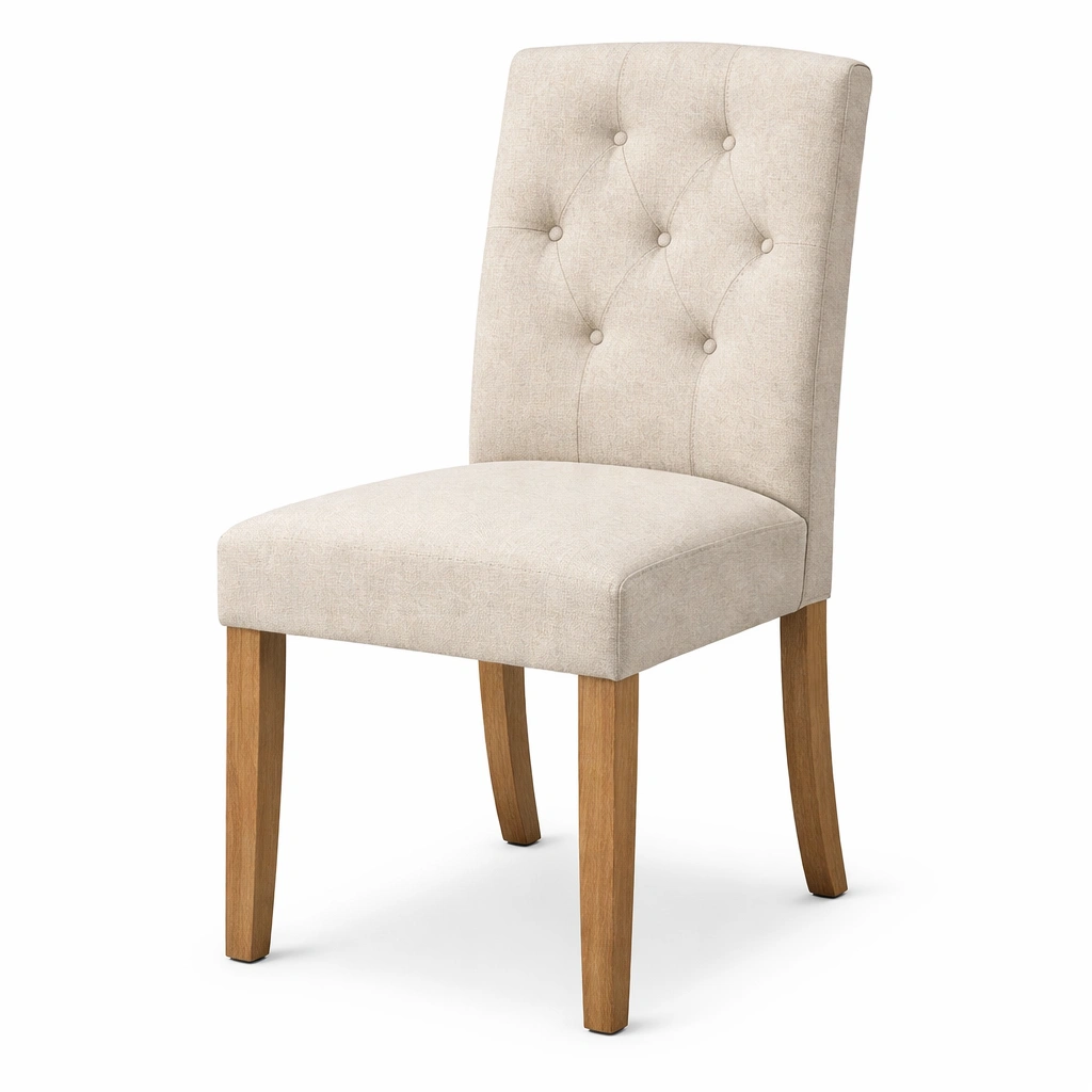 La silla de comedor cuenta con un tapizado de lino beige y botones decorativos en el respaldo. Las patas están hechas de madera de roble.